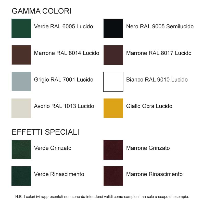 The coloring is made with the company painting machine, with powder coating in a wide range of available colors. This process, unlike the liquid paint, guarantees long life of the material and requires very little maintenance.