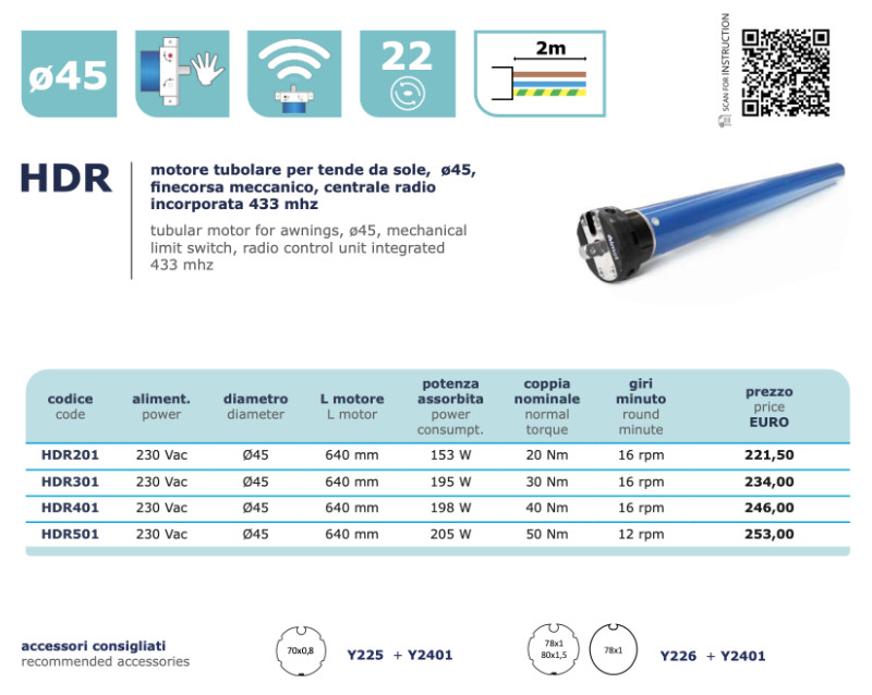 HDR501 - tubular motor for awnings, ø45, mechanical limit switch, built-in radio control unit 433 mhz