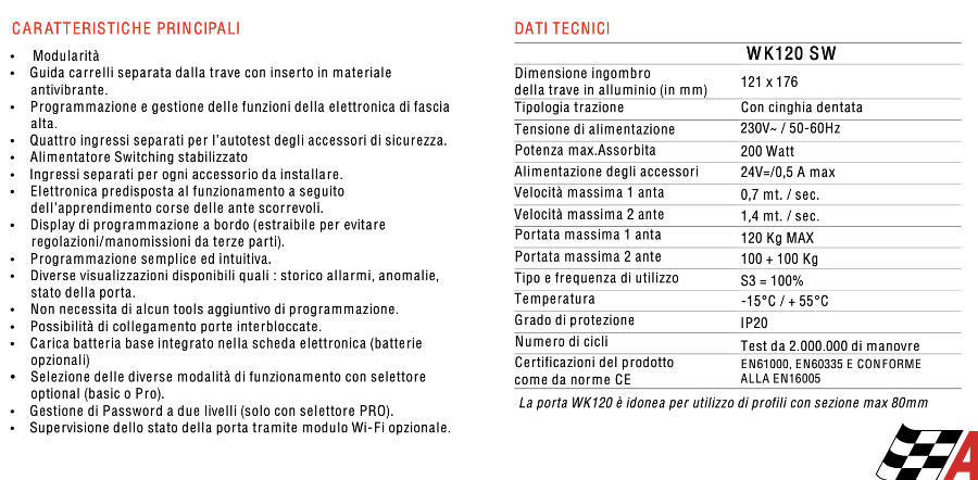 To complete the installation, we recommend adding radar sensors for control and safety, preferably in dual technology. Photocells, remote controls, radio receivers, wireless selectors and Wi-Fi modules are also available. All components are compatible with the WK120 control unit.