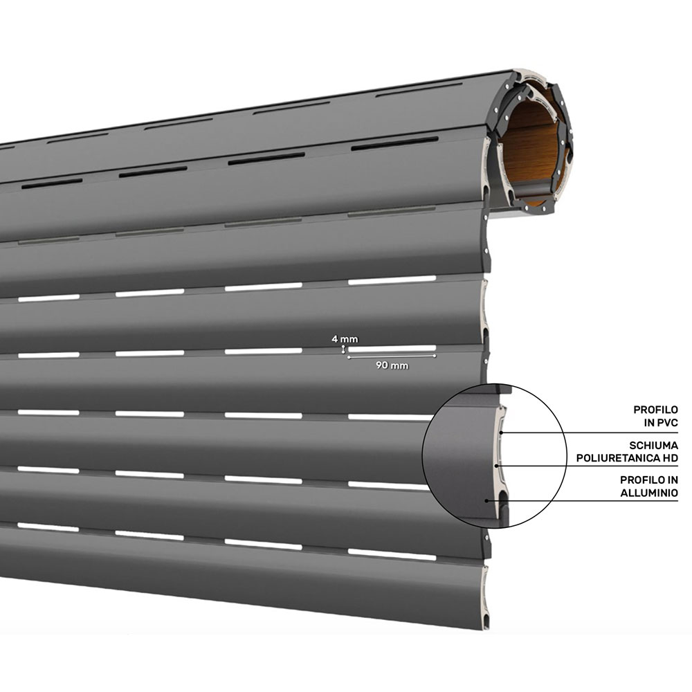 AriaLuceTherm Pinto is a roller shutter with external profile in insulated aluminum with wide hole and internal profile in PVC.