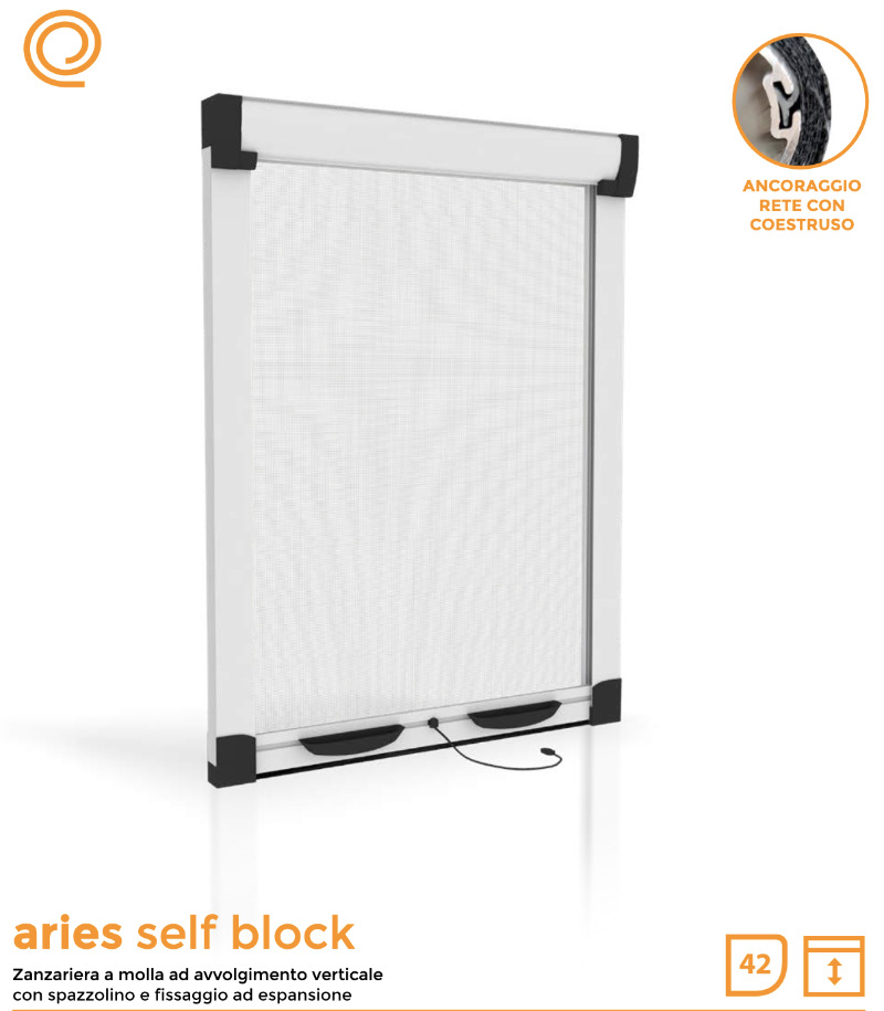 - Aries Self Block Effezeta System mosquito net equipped with a self-blocking brush, ideal for fixing without expansion screws ;
