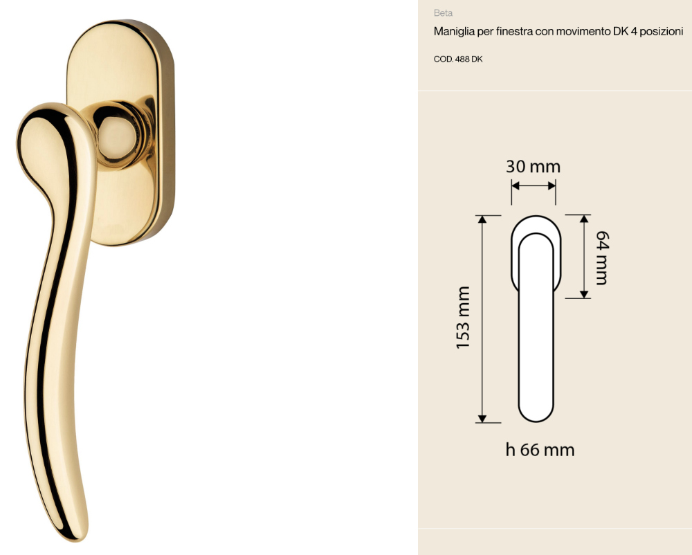 Featuring a 4-position DK system, this handle ensures practical and safe use for tilt-and-turn windows. Craftsmanship and 100% Italian manufacturing ensure quality, durability, and lasting beauty.