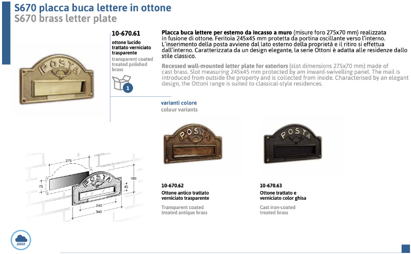 Placca Buca lettere Classica in Ottone - per Esterno da Incasso a Muro - Silmec S670