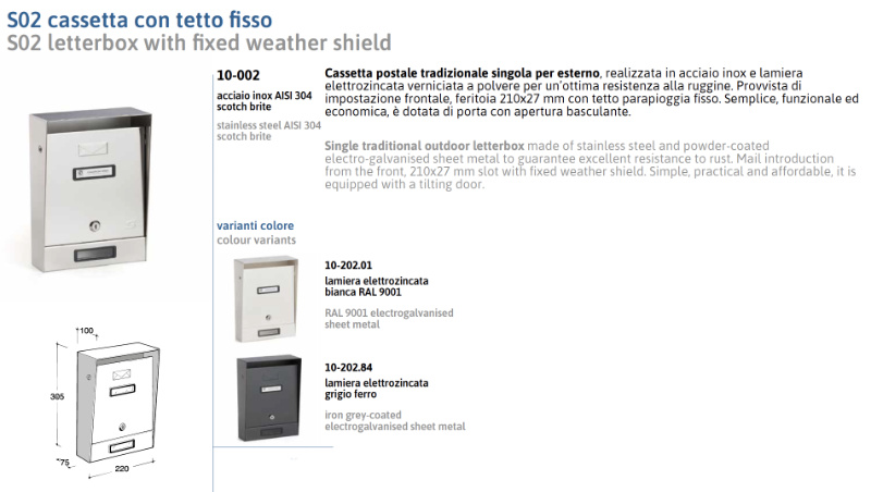 • Silmec S02 single mailbox for outdoor use, in stainless steel and electro-galvanized, powder-coated sheet metal with high resistance to rust;