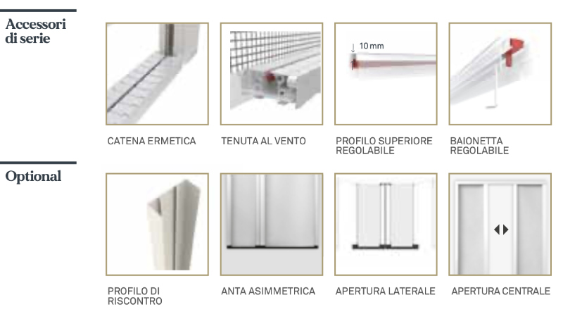 The selected metallic finishes want to connote the profiles as elements of completion and at the same time of accent, in outdoor and indoor contexts characterized by architectural choices - more and more precise and refined and in constant evolution - of liveability of spaces, fusion of environments, of combination of materials and furnishings.