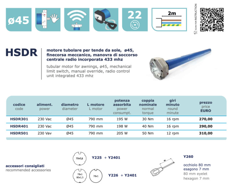 • HSDR401 engine : tubular engine with emergency control, 433 MHz radio.
