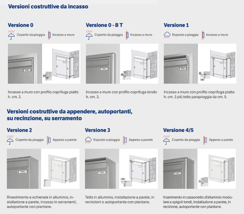 - Version 4/5 : insertion in modular aluminum box with round edges, wall installation, in fences, recessed in windows, self-supporting with uprights.