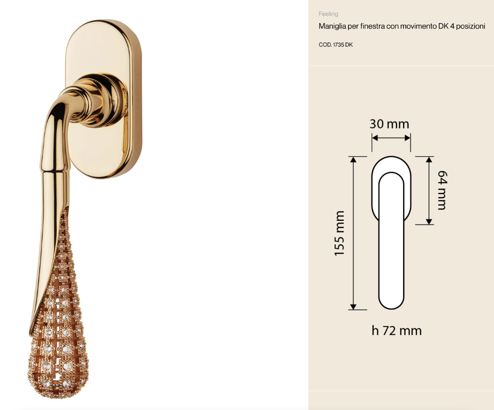Feeling Linea Calì Swarovski window handle collection celebrates discreet luxury and the excellence of Italian craftsmanship, combining refined design and precious details. Each window handle is a small decorative gem, embellished with