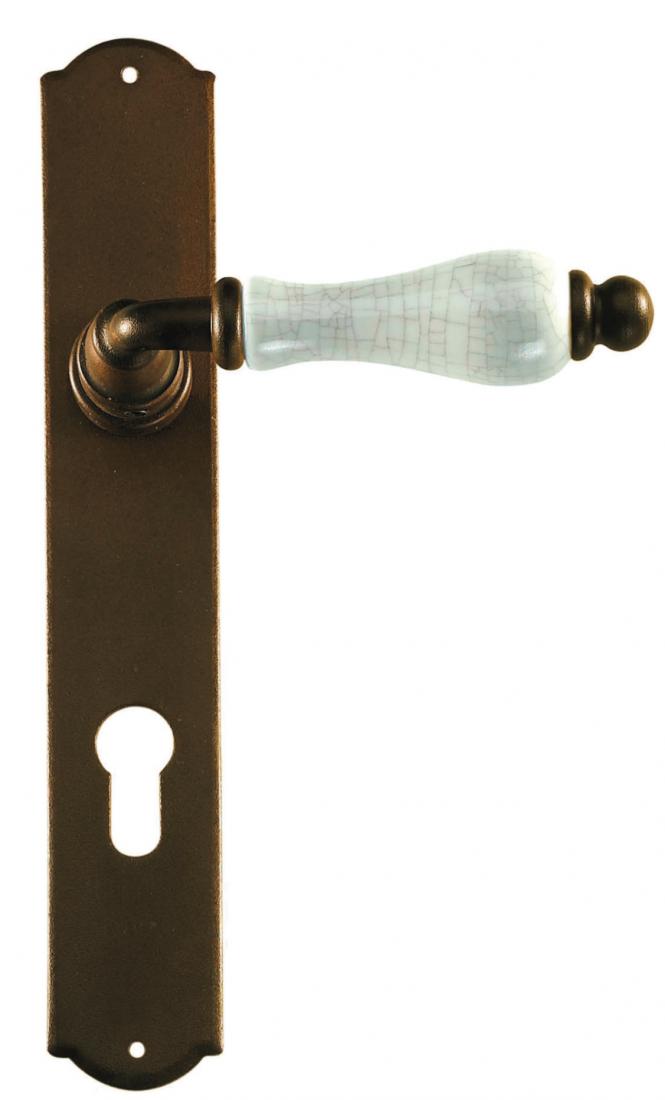 Iron door handle with porcelain grip, version on plate model Galbusera Praga.
