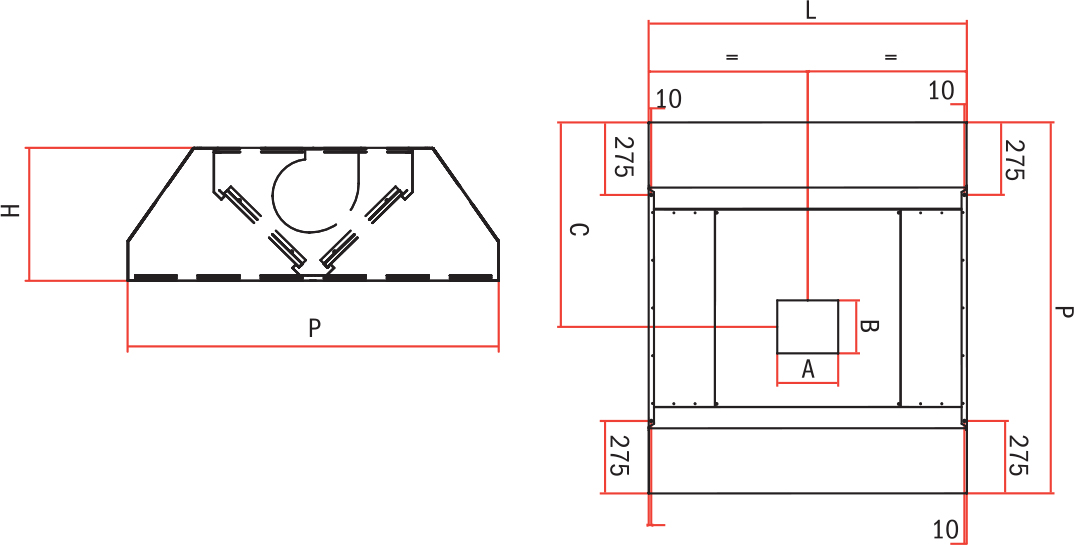 • Profile detail for cooking blocks with a depth of 60-70-90 cm, positioned in the center of the room;