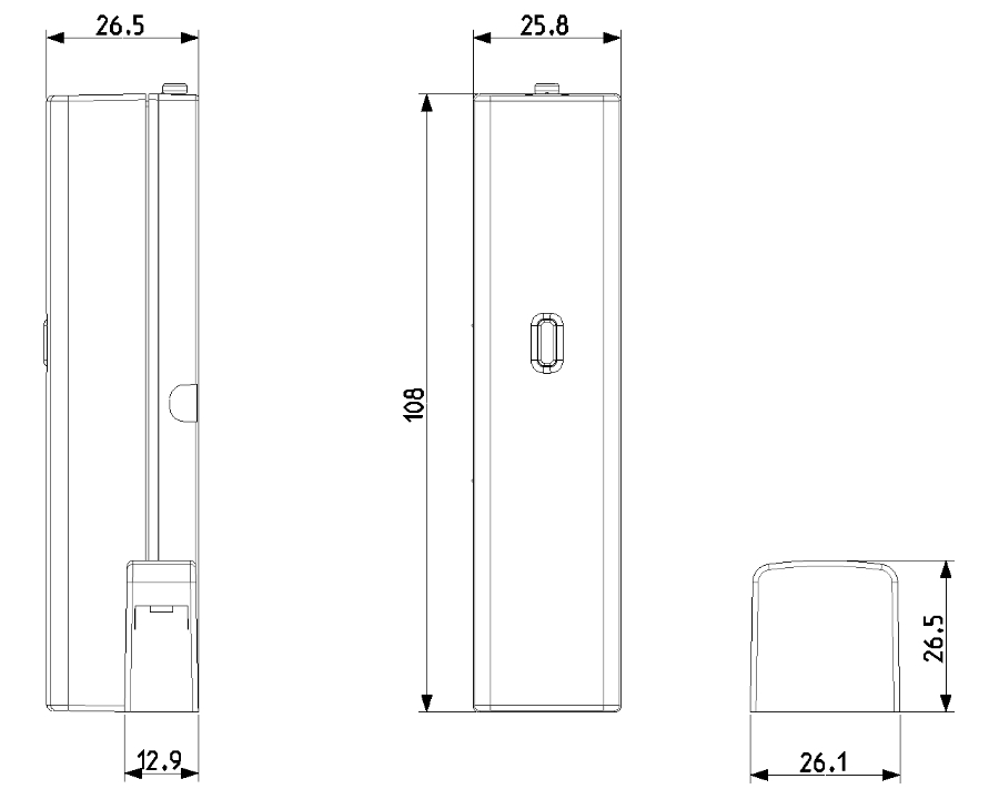 - 1 bi-color LED to signal configuration status (blue flashing) and output status;