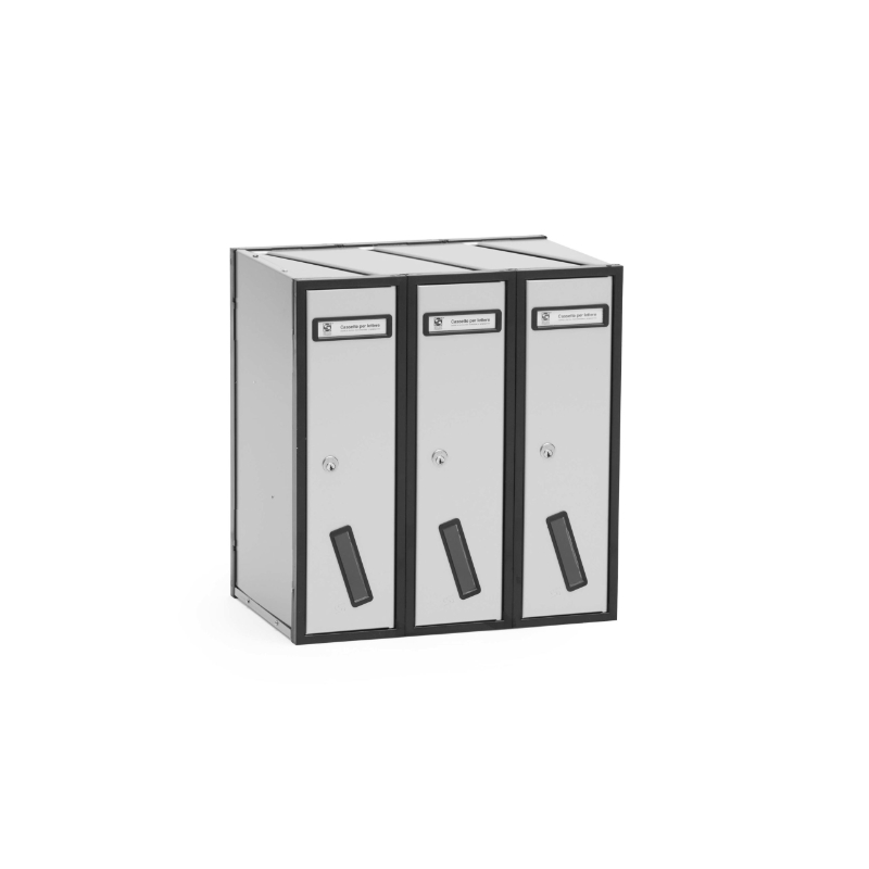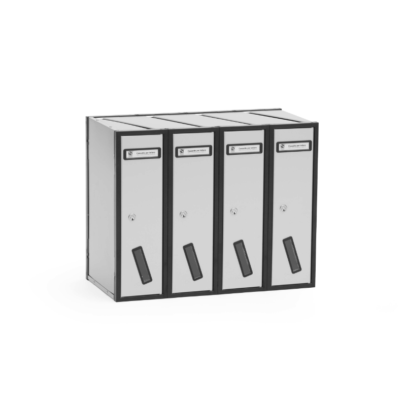 Mailbox of variable dimensions , made up of a variable group of magazine-sized boxes (3/4/5) and complete with aluminum cladding on all 4 sides, in the same color as the doors.