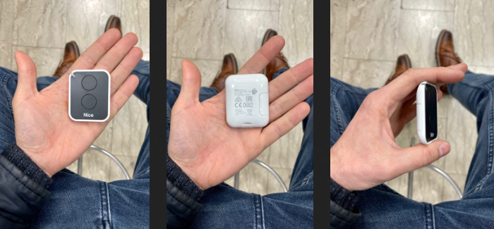 Programming the Nice gate remote control is really easy: placing my old remote control in front of the new one, I first pressed the button of the new remote control for 6 seconds, then the button of the old remote control for 3 consecutive times, and finally the button I have again. chosen over the new.