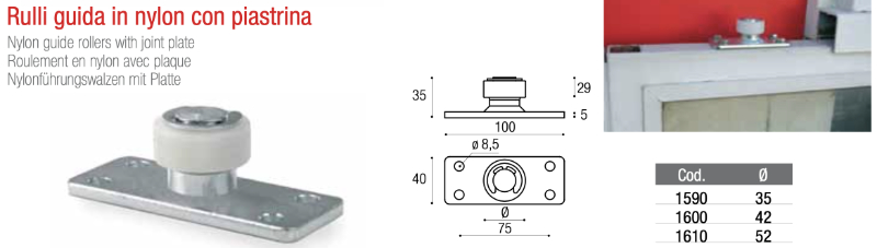 Nylon guide rollers with plate : measurements and technical characteristics are indicated below.