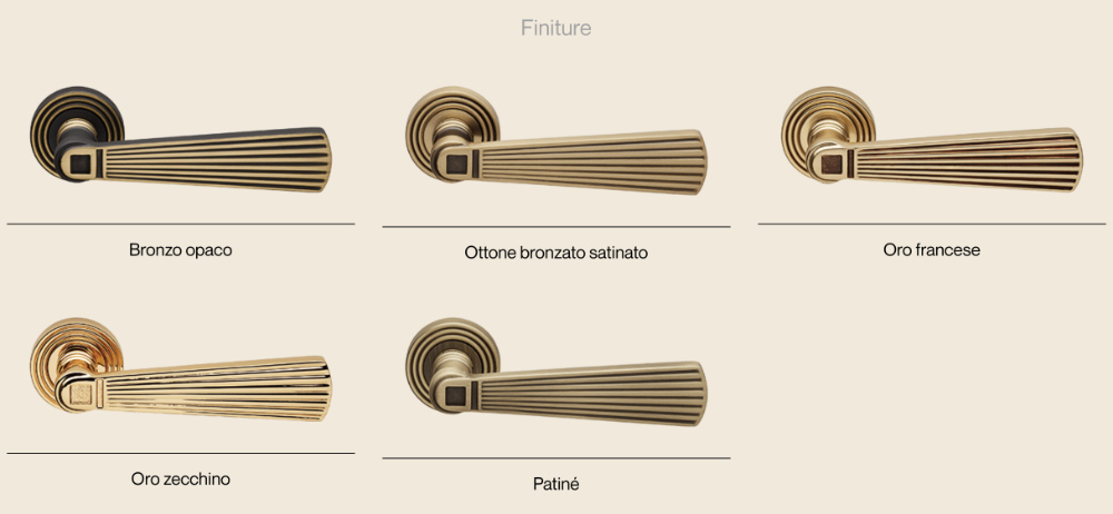 five premium finishes – matt bronze, satin bronze brass, French gold, pure gold, and patiné – it offers a wide aesthetic versatility that adapts to any type of door and furnishing style.