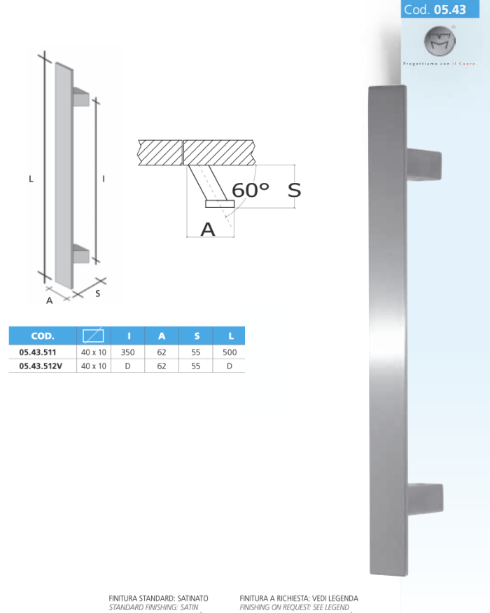 40x10 inclined rectangular bar handle - Code MPM 05.43 with center distance 350 mm.