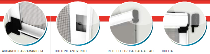The R-1 Effe model is the traditional fly screen par excellence. It has a vertical scrolling spring winding with a 50 mm overall dimensions box.