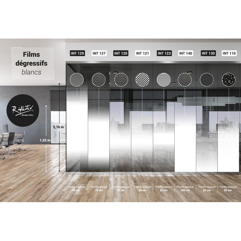 This decorative degressive film can be used to hide a specific area of a window, wall or piece of furniture with glass. Reflectiv INT 120 film stands out with its thin diffused white central stripe, a degressive design that offers a perfect balance between aesthetics and practicality.
