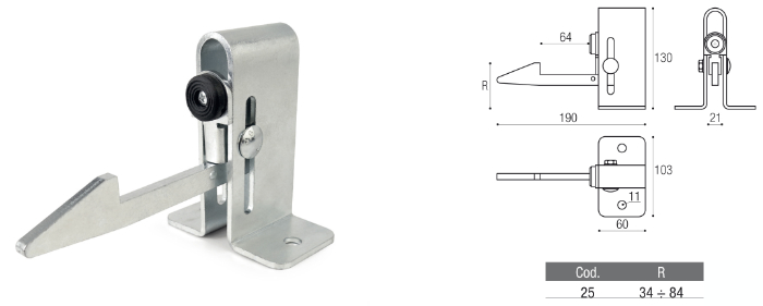 This professional gate stop is adjustable in height up to a maximum of 84 mm . Gate stop for doors designed for 64 mm tubulars, equipped with a rubber stop to cushion the blow.