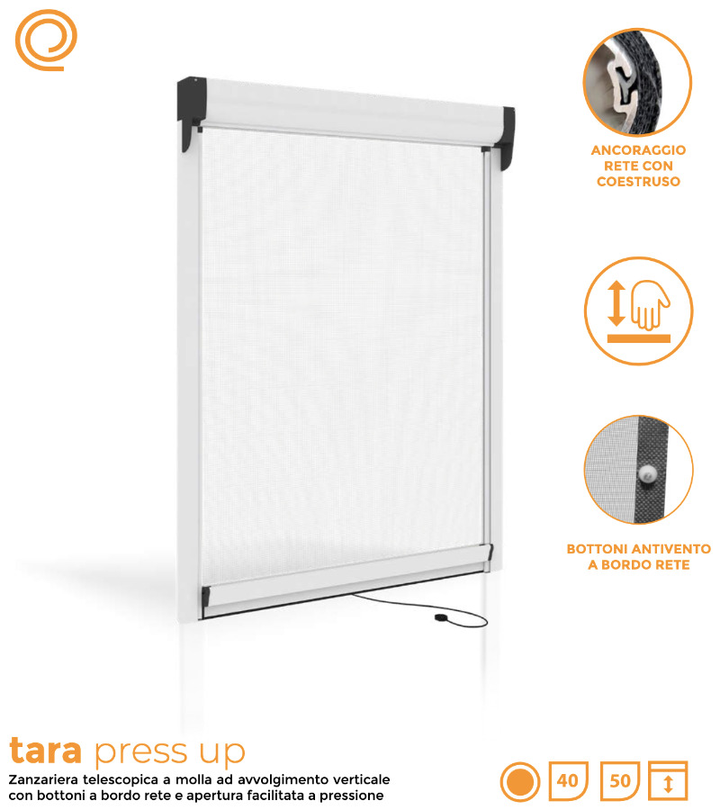 • This Tara Press Up vertical insect screen has a 50 mm footprint . The version with 40 mm overall dimensions is also available (for spaces with reduced dimensions);