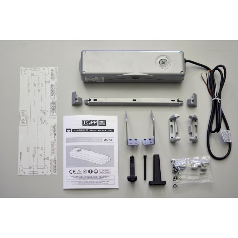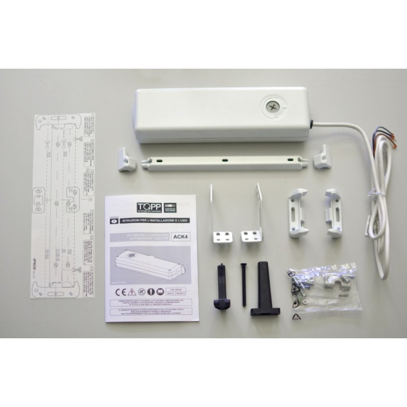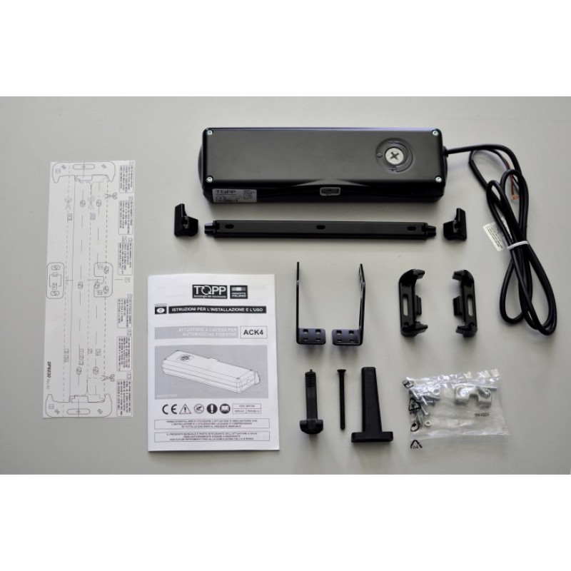 Included in the package: chain actuator, fixed front mounting bracket, vasistas bracket, connection to the window frame with pin and small parts package.