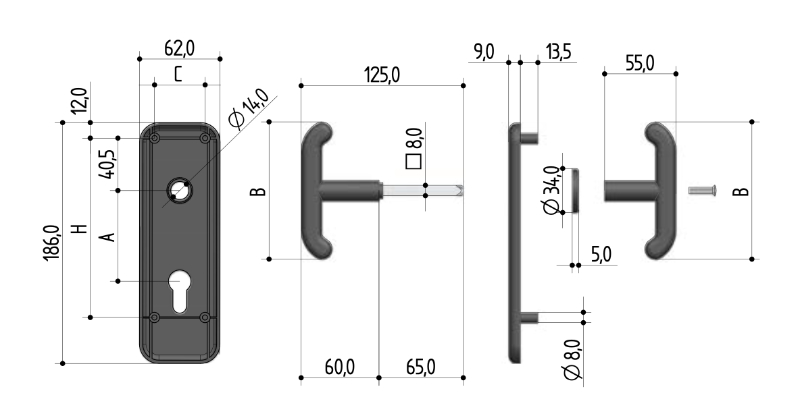 This handle is equipped with a Yale hole plate and a 70 mm center distance, suitable for different types of up-and-over doors.