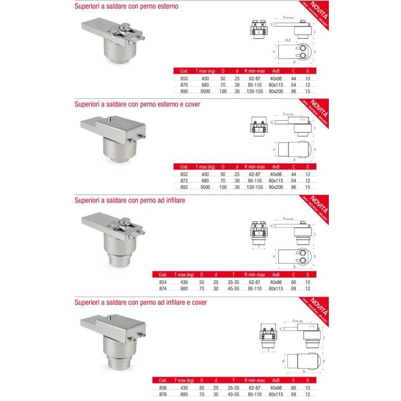 - Upper hinges to be welded with insert pin and cover (codes 856, 876).