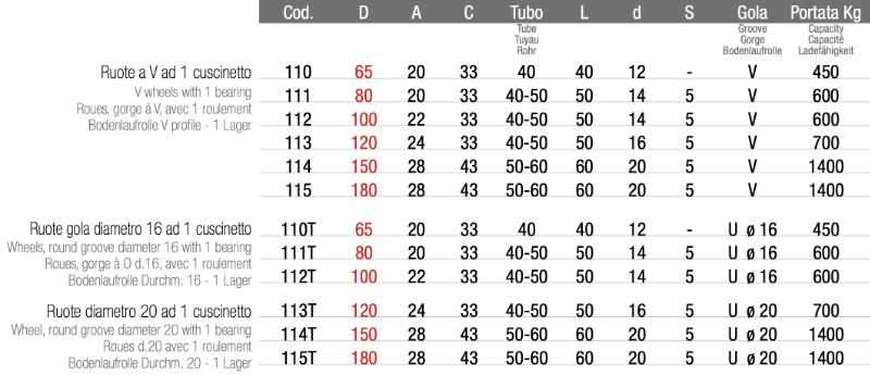 Wheel diameter (D): various sizes from 65 mm to 180 mm to adapt to any load requirement and gate size;