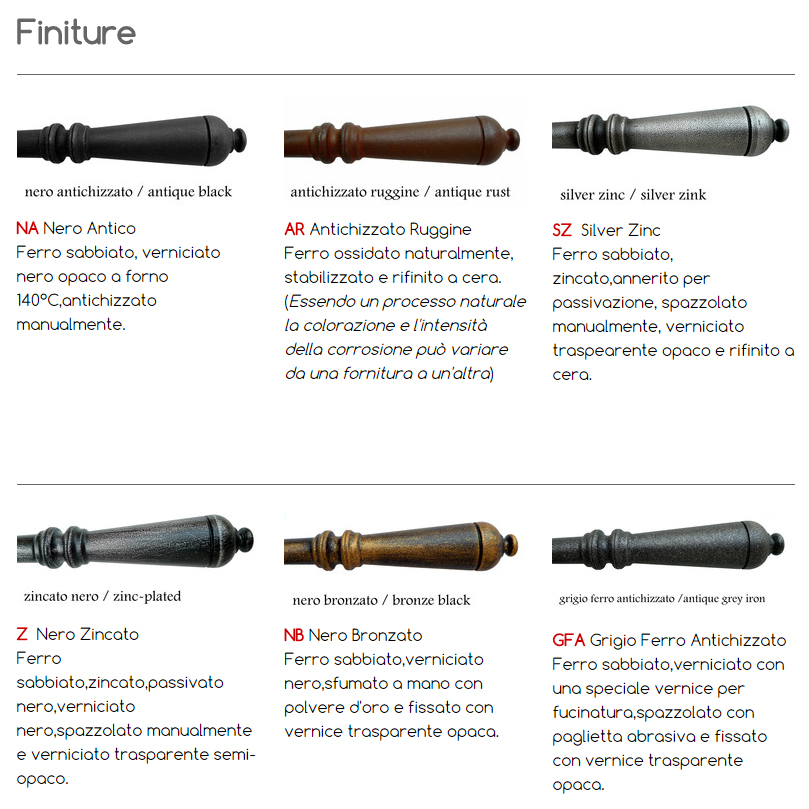Finish to choose from: Antique Black, Zinc-Plated Black, Antique Rust, Bronzed Black, Silver Zinc and Antique Iron Grey (to see the effect of the different finishes you can look at the image below).